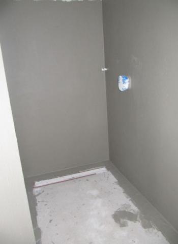 Die begehbare Dusche wurde mit einem Gefälle versehen; Am hinteren Ende sieht man die Ablaufrinne, die ebenfalls gefliest wird. Außerdem hat unser Fliesenleger Herr Langfermann alles abgedichtet.
