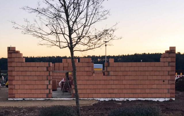 Selbst heute am Samstag waren die Maurer fleissig und haben weiter Stein auf Stein gesetzt. Die erste Hauswand (Nordseite) ist schon fast fertig.