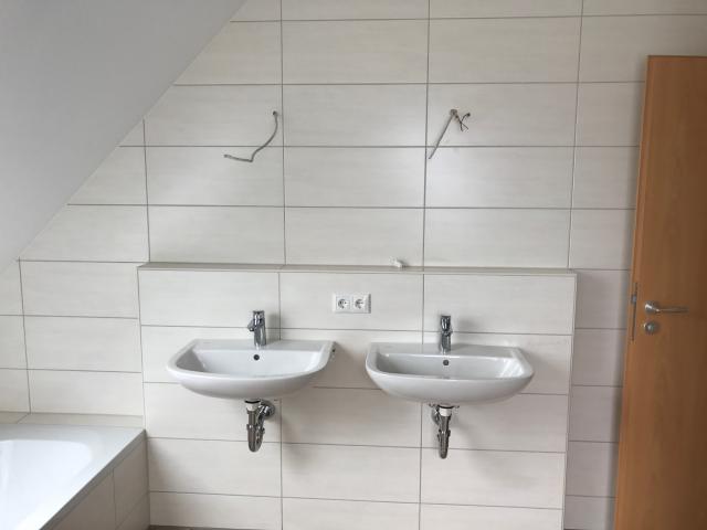 Am Mittwoch wurde vom Sanitärer die zwei Bohrungen im Kamin verschlossen. Am Donnerstag wurden die Waschbecken, Dusch- und Badewannenarmatur installiert, mit der WC-Installation begonnen und die Thermostate an den Heizungen angebracht.