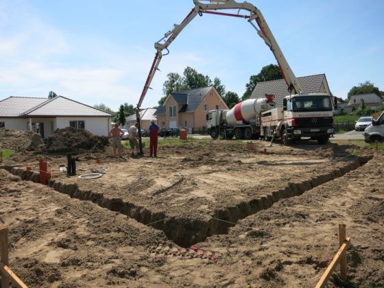 Bei sommerlichen Temperaturen geschieht etwas auf unserem kleinen Stückchen Land. Kurz nach der Absteckung der Grundfläche ging's gleich mit den ersten Arbeiten zur Erstellung der Bodenplatte los. Erst war da ein großes Loch, dann ragten Rohre aus der Erde und am äußeren Rand wurde Beton vergossen ...