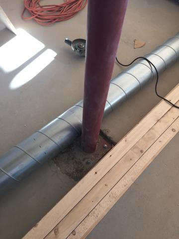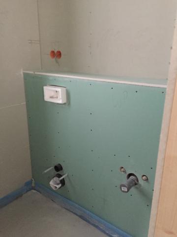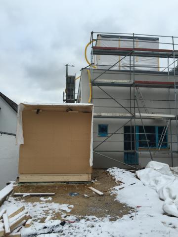links unten in der Ecke musste ein Loch gemacht werden, da die Wand wohl sonst nich aufgestellt werden konnte. Die Anschlüsse waren im Weg. Klärung mit dem Holzbauer folgt nächste Woche.