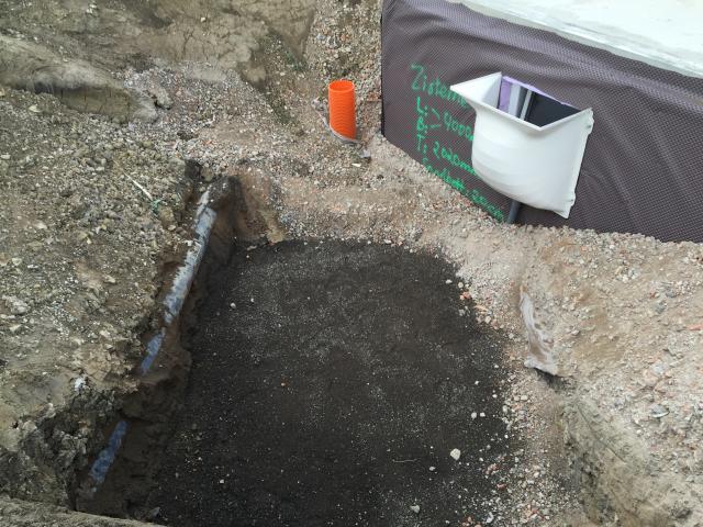 Bei der Kontrolle durch den Erdbauer stellten wir fest, dass der Überlauf niedriger als der Regenwasserkanal ist.