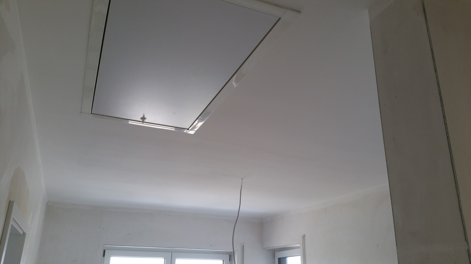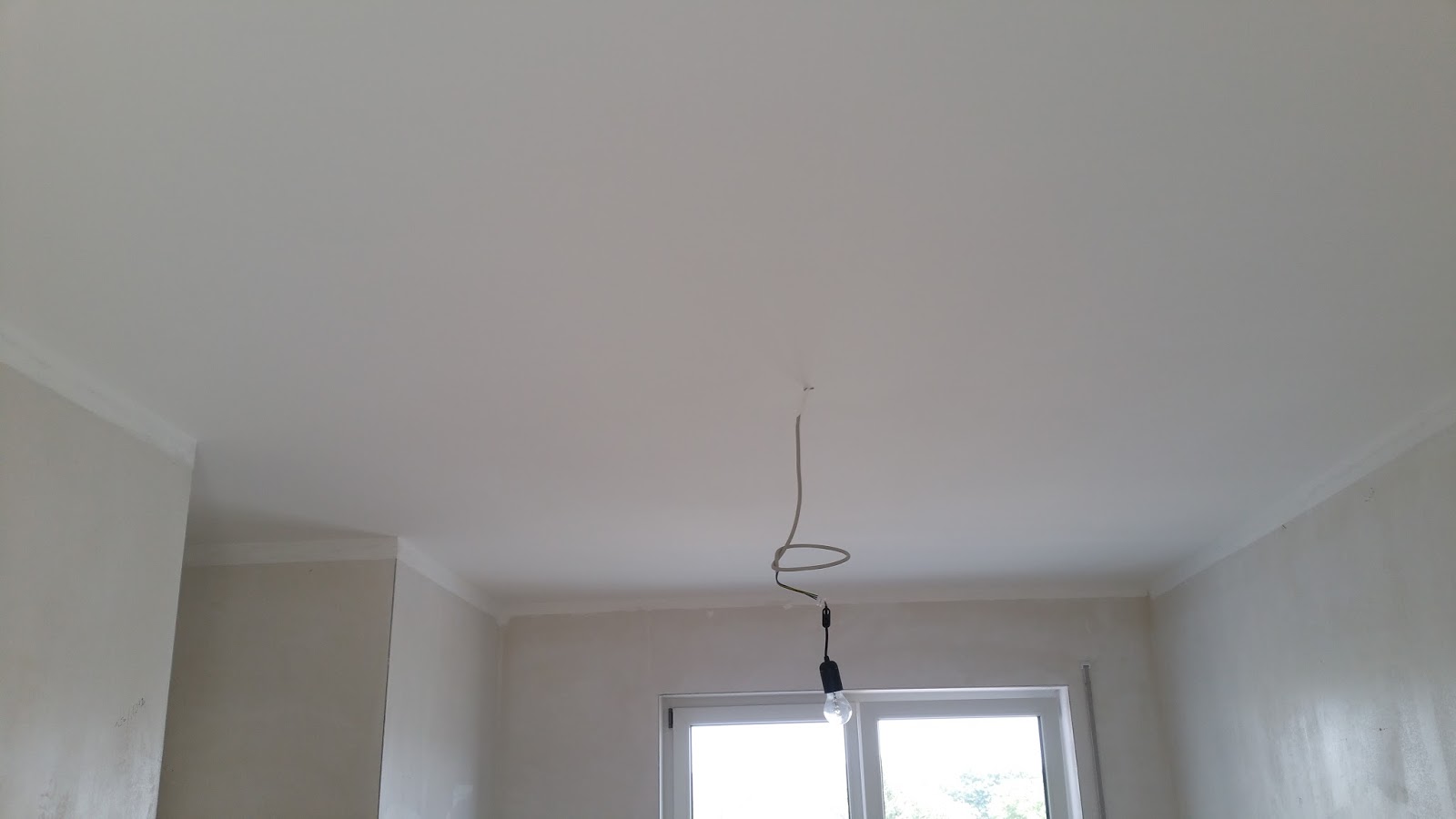 Jens uns Jürg waren ja bereits in KW 31 fleißig und haben zuerst noch alle Decken etwas verspachtelt. Nicki und ich haben sie dann komplett grundiert und anschließend haben die zwei Männer sie mit weißer Silikatfarbe gestrichen.