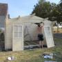 Dann konnten wir endlich das Paket mit der Hütte öffnen und anfangen zu bauen. Doch leider waren alle unsere vorherigen Abmess- und Ausrichtversuche sinnlos gewesen, weil das Haus seine eigene Definition eines rechten Winkels hatte und so waren wir froh wenn jede Latte des Grundgerüstes irgendwie auf einem Stempel des Fundaments lag und begannen dann das Haus hochzuziehen, Türen einzubauen und dann das Dach zu decken.