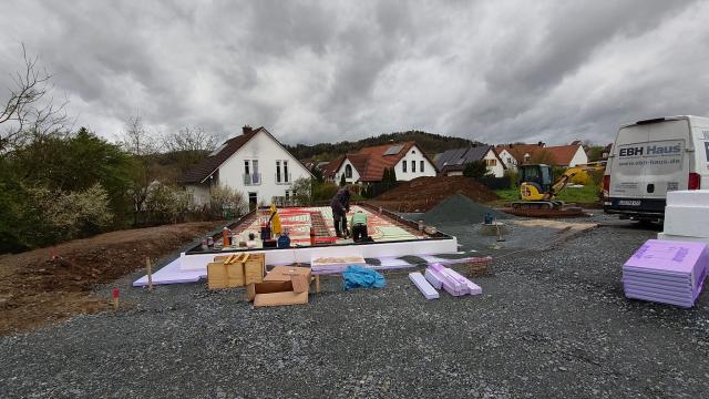 Unsere Schwedenplatte nimmt immer mehr Gestalt an. Gestern wurde die Fußbodenheizung verlegt und auf Dichtigkeit geprüft. Es macht richtig Spaß, den Mitarbeitern von EBH Haus zuzuschauen. Trotz Starkregen und kühlen Temperaturen merkt man, dass ihnen die Arbeit Spaß macht. Das Motto "Wir machen es so gut, als wäre es unser eigenes Haus" ist wirklich erkennbar.